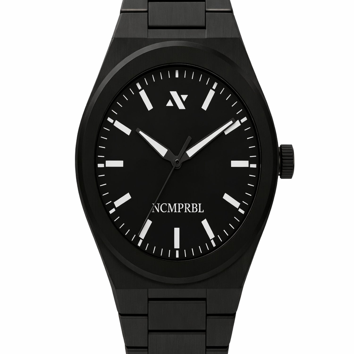 Elevate Link Phantom Swiss Movement Watch, 42MM in Brushed Matte Black and Silver is the ultimate statement watch to complete any silent luxury look in your wardrobe. This all black swiss movement watch fuses classic and contemporary style with an illuminated dial providing night-time visibility, and a brushed matte black tri-link metal quick-release bracelet strap.