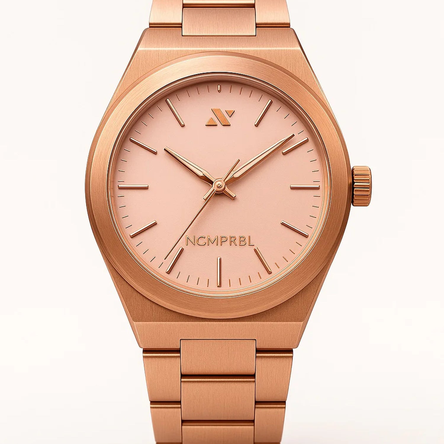 Elevate Link Rosé 42MM Swiss Movement Watch, 42MM In Brushed Rose Gold and Sunray is our flagship distinguished timepiece that enhances any style. This 42MM Unisex timepiece features a striking brushed rose gold case, a beveled case dial for women who prefer a larger wrist size and perfect signature size for men with a heartbeat of swiss ronda quartz 763 swiss movement. Features an illuminated dial to ensure clear visibility both day and night.